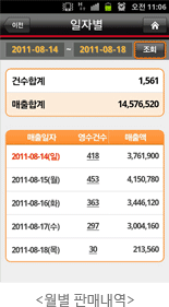 스마트폰에 내장된 인터넷 브라우저 이외에 안드로이드, 아이폰 용 Hybrid App를 통하여 실시간으로 매출정보 조회 서비스를 이용할 수 있습니다.